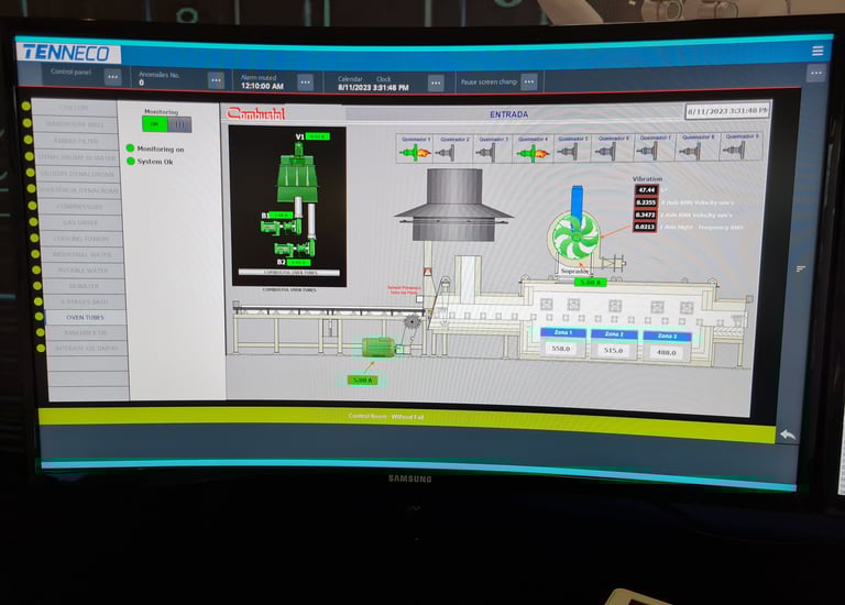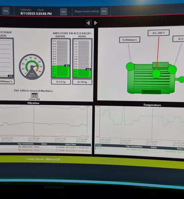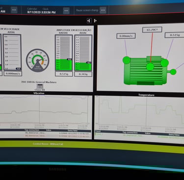 Monitoramento preditivo com sensores de vibração, corrente e temperatura.